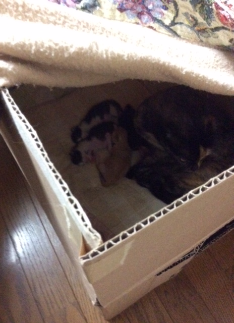 もう一つの箱に同じように座布団とタオル、薄いフリースを敷いて用意しました。